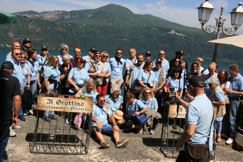 innamorati, dalla quale si può ammirare non solo il lago ma anche il museo delle navi romane, il tempio di Diana Nemorense e la particolare conformazione del territorio, nel quale erano stati scavati dei lunghissimi cunicoli nella roccia già dai tempi degli antichi romani. Dopo la meravigliosa passeggiata è finalmente giunto il tanto sospirato momento di assaggiare la caratteristica crostatina alle fragoline di bosco e bere un meritato caffè seduti al tavolo, giusto in tempo per riabbracciare anche un altro storico socio venuto in 850 da Civitavecchia a salutare i partecipanti. Il rientro in Hotel è stato caratterizzato da un ulteriore percorso panoramico che ha visto il corteo attraversare i pratoni del Vivaro tra le due montagne, l’ippodromo più grande d’Europa, le mucche al pascolo e le ginestre in