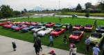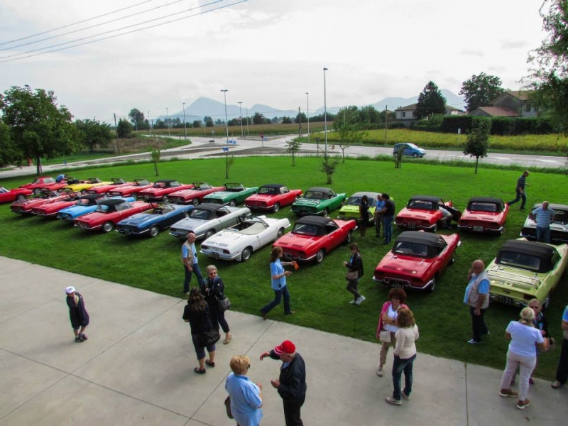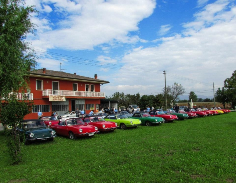del pianeta: Matteo e Filippo Luxardo, discendenti del fondatore che diede vita all’azienda nel 1821 a Zara, ci hanno ospitato per una visita guidata che è partita dagli alberi di marasca per arrivare all’imbottigliamento passando per i locali di distillazione, infusione ed affinamento in grosse botti; non è mancata la descrizione dei processi produttivi dei vari prodotti aziendali che è sfociata in una degustazione nell’attiguo outlet dove gli ottecentocinquantisti hanno fatto man bassa di liquori e di marmellate; molto gradito l’omaggio consegnato ad ogni equipaggio, consistente in un sacchetto contenente il Sangue Morlacco, l’esclusivo cherry della casa, assieme ad un paio di cappellini griffati Luxardo; e proprio i cappellini sono stati di buon auspicio in quanto nel frattempo è uscito il sole e piano piano le spider hanno cominciato a scoprirsi; a questo punto, carburati a puntino dagli assaggi, i driver si sono lanciati nel percorso panoramico dei colli affrontando la salita del Roccolo fino a raggiungere il belvedere alla sommità del Monte Fasolo, dove il gruppo ha sostato qualche minuto per una foto ricordo e per ammirare il panorama sulla pianura veneta; il tempo vola per cui via di nuovo in marcia verso il delizioso borgo medioevale di Arquà Petrarca: dopo un’interessante visita alla casa che ospitò il celebre poeta nei suoi ultimi anni di vita, abbiamo fatto una passeggiata in centro con degustazione del brodo di giuggiole, il tipico liquore locale prima del rientro in hotel. Sabato mattina, finalmente sotto uno splendido sole (ma con una temperatura inclemente con la quale solo pochi coraggiosi hanno scoperto l’auto da subito) la carovana, percorrendo strade panoramiche tra boschi, ulivi e vigneti, ha raggiunto Cinto Euganeo per visitare il museo geopaleontologico ricavato nel sito di archeologia industriale di Cava Bomba; ai visitatori sono state illustrate le caratteristiche della zona a partire dalla preistoria, quando l’area era occupata dal mare, fino allo sviluppo del vulcanesimo e delle conseguenze che questo ha avuto sulle acque termali, diffusissime in loco. A visita ultimata siamo ripartiti per una gradita sorpresa: siamo infatti andati a Campiglia dei Berici dove siamo stati ospiti della famiglia Ghiro per un piacevole aperitivo nel prato antistante la loro abitazione; l’atmosfera amichevole che caratterizza da sempre i nostri incontri non è sfuggita ai nuovi soci che si sono subito inseriti a meraviglia. Dopo il pranzo abbiamo riacceso i motori per dirigerci verso il castello Cini di Monselice; l’accoglienza è stata a dir poco strepitosa, merito del lavoro dei nostri organizzatori: infatti siamo stati accolti al rullo di tamburi da figuranti in costume medioevale; all’ingresso due guardie in livrea e anche all’interno guide e animatrici vestivano rigorosamente costumi dell’epoca, un’altra sorpresa regalataci dai nostri giovani organizzatori; la visita è stata davvero interessante: l’armeria dispone di un quantitativo formidabile di armi antiche mentre la parte residenziale è completamente arredata da pregevoli mobili antichi; singolari i caminetti dal
