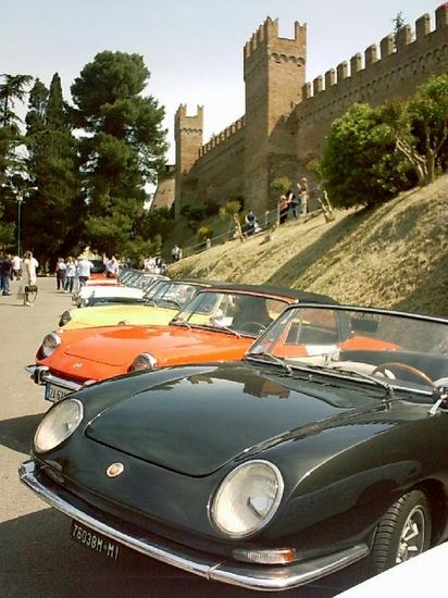 La lunga carovana di Spider composta da circa 40 auto si mette in moto per raggiungere la Rocca di Gradara, questa, visibile da tutto il circondario, si impone maestosa sul paesaggio circostante, le nostre Spider fanno da cornice ad un paesaggio dal sapore antico, distante dal caos delle grandi città.