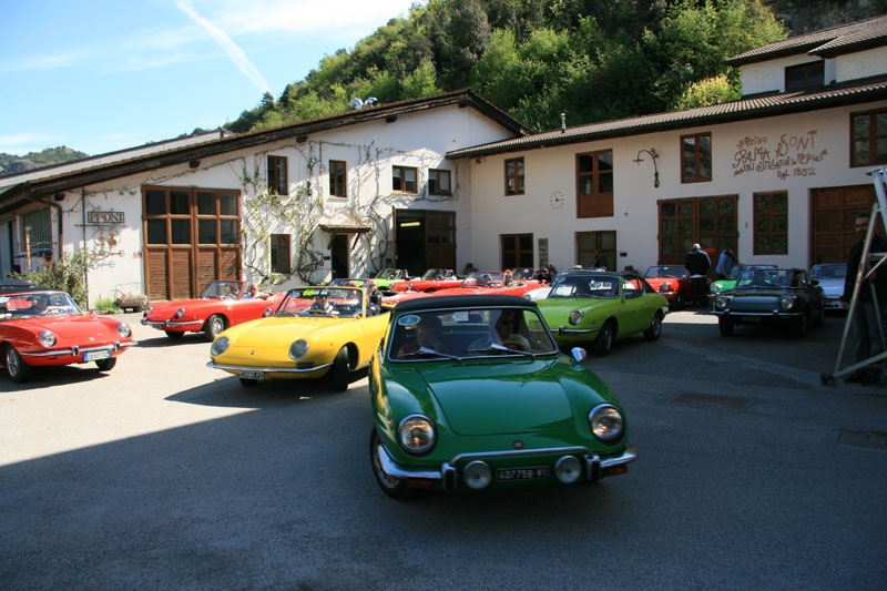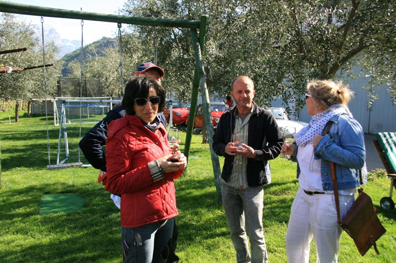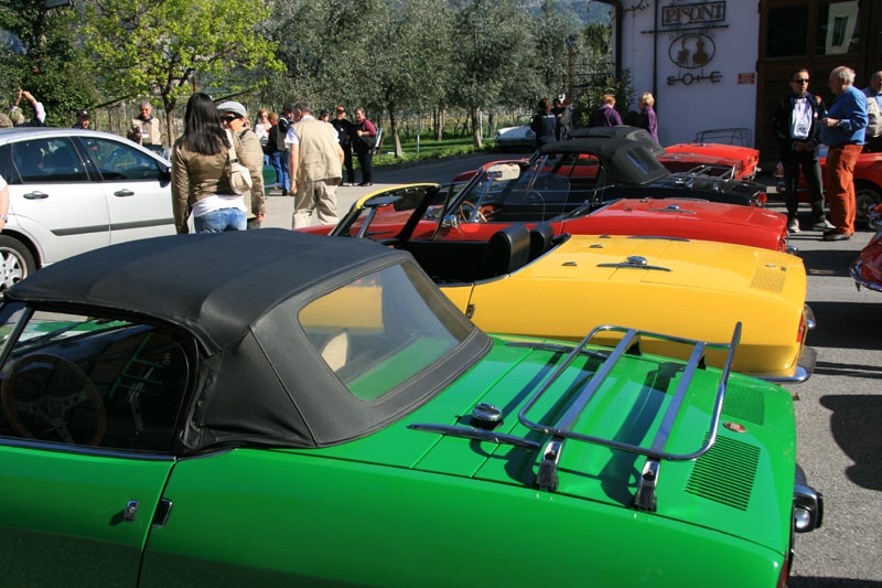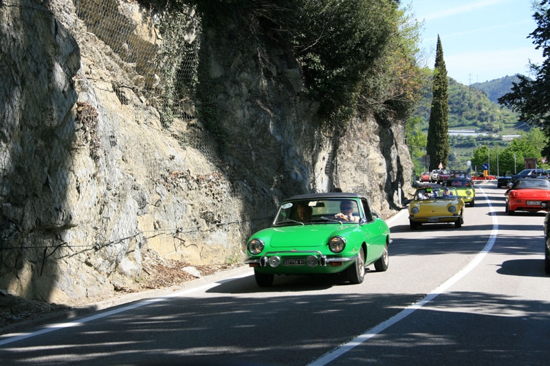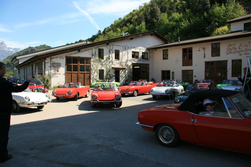 Magnifico anche il programma del sabato che ci ha portato alla scoperta di altri tre bacini lacustri: in primis quello di Cavedine in cui la quiete regna sovrana: per raggiungerlo abbiamo attraversato le Marocche di Dro, un singolare percorso fra rocce originate da un insieme di frane postglaciali che rendono la zona il fenomeno franoso più importante a livello europeo; di sicuro un panorama bello ed insolito che ci ha accompagnato fino a Pergolese dove abbiamo visitato le famose cantine e distillerie Pisoni: ai radunisti è stata offerta una degustazione prima della visita guidata in cui i titolari hanno illustrato il sistema di spumantizzazione dei vini e di distillazione delle vinacce. Foto di rito e “assalto in massa” allo spaccio aziendale hanno completato la tappa prima della ripartenza verso il lago di Toblino, presso il quale non è stato possibile sostare vista la conformazione del territorio: abbiamo potuto però ammirarlo costeggiandolo prima di dirigerci a Fiavè per la degustazione di formaggi tipici presso il locale caseificio. Dopo questa tappa abbiamo risalito il passo del Ballino, valico che mette in comunicazione la zona del Garda con le Valli Giudicarie: le montagne innevate facevano un piacevole contrasto con il caldo esploso improvvisamente, cosa che ha consentito di godersi appieno le spider; memorabile pranzo presso il ristorante “da Lucio” che ci ha proposto un menù tipico trentino che ha entusiasmato i partecipanti; nel pomeriggio ci siamo invece diretti verso il lago di Tenno, piccolo specchio di acqua azzurrissima che una ricerca ha definito come il lago più pulito d’italia: il bacino lacustre è sovrastato da una collina su cui sorge il borgo medioevale di Canale di Tenno, inserito meritatamente nell’elenco dei borghi più belli del nostro paese: lo abbiamo visitato percorrendo i ripidi vicoletti lastricati e respirando le atmosfere di un tempo; il perfetto stato di conservazione fa sì che il paese sia spesso utilizzato come set cinematografico; nuovo rientro in hotel per una nuova serata di gala in compagnia, allietata da una lotteria con premi a base di specialità gastronomiche modenesi: qualche maligno ha insinuato che sia stata