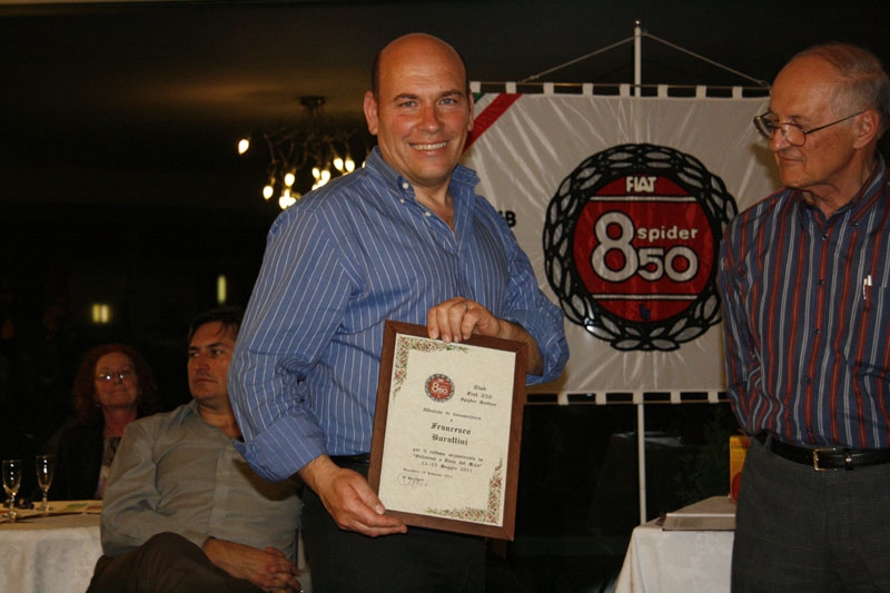 inventata dal presidente per eludere ancora una volta il famoso discorso… nulla di più probabile! E’ seguito un brindisi con bottiglie personalizzate da un’etichetta realizzata da Davide, il nostro mago della grafica che, nell’ombra, lavora per il Club instancabilmente: ha infatti curato anche la realizzazione delle felpe, dei tappetini, dell’adesivo del raduno e della splendida targa ottonata rilasciata ai partecipanti a ricordo della ricorrenza; Chizuko, gentile come sempre, ha voluto dare un suo omaggio ad ogni partecipante.