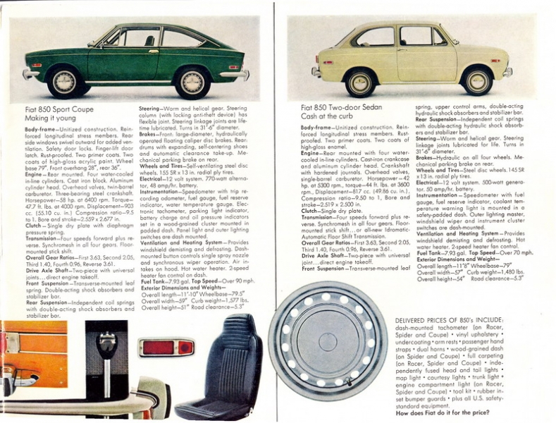 Gamma Fiat «850» per il mercato USA – 1968Questo è uno dei depliant della gamma 850 per il mercato USA realizzato dall’importatore “Roosevelt Motors Inc.”. Sono passati in rassegna i modelli “Sport Spider”, “Sport Coupé” e “Sedan”. Dopo una bella foto di copertina, seguono una serie di ambientazioni fotografiche un po… americane. Per ogni singolo modello sono descritte le caratteristiche peculiari e sono indicate le caratteristiche tecniche.