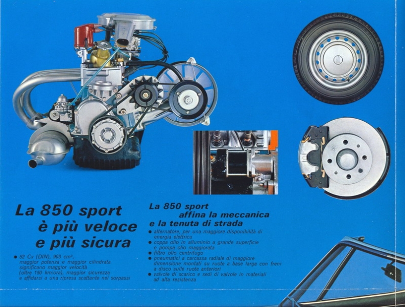 Questo è il depliant “ufficiale” e più diffuso della Fiat «850 Spider» o anche “prima serie”, la Spider viene mostrata nelle sue diverse configurazioni e nell’ultima pagina sono descritte le caratteristiche tecniche. Suggestivo lo “spaccato” dell’auto che mostra la disposizione degli organi meccanici e della trasmissione.