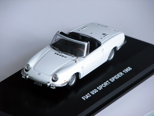 La Fiat «850 Spider» ed il mondo del modellismo hanno avuto, nel tempo, un’evoluzione un po particolare. Quasi contemporaneamente alla commercializzazione dell’auto (1965), fu messa in vendita la riproduzione 1/43 realizzata dalla «Mercury», dopo qualche anno fu la volta della «Auto Pilen» che realizzò la riproduzione 1/43 della Seat «850 Sport Spider», questa veniva commercializzata in Spagna su licenza Fiat. Poi, oltre ad una rivisitazione del modello della «Auto Pilen», non sono più state effettuate riproduzioni di rilievo della piccola spider Fiat. A risvegliare gli entusiasmi ci ha pensato nel 2003 la tedesca «Minichamps» con la realizzazione di una bellissima riproduzione 1/43 della Fiat «850 Sport Spider» di colore rosso seguita negli anni successivi dalla versione verde chiaro e giallo. Da quel momento si sono succedute altre versioni della Fiat «850 Sport Spider», la prima, di colore rosso, inserita in una collana venduta nelle edicole a cura della «De Agostini» con fascicolo allegato, la seconda, di colore bianco, distribuita dalla «Edison». Nel 2009 si è finalmente rivista una riproduzione 1/43 della Fiat «850 Spider» di colore bianco, inserita in una collana venduta nelle edicole a cura della «Hachette» con fascicolo allegato. E’ un vero peccato che non esistano ancora riproduzioni in scale diverse (1/18, 1/24….) della spiderina, la storia della vettura e l’interesse collezionistico che suscita meriterebbero una maggiore attenzione da parte delle case di produzione di automodelli in scala.